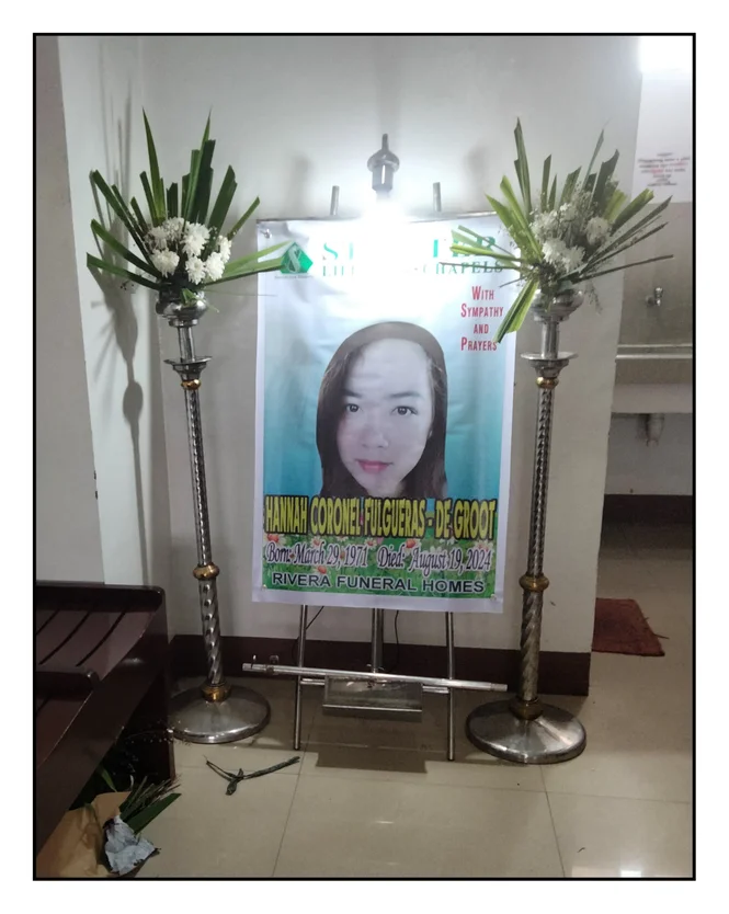 OP 19 AUGUSTUS ,2024 GING IK NAAR MIJN VROUW HANNAH TOE OM HAAR NABIJ TE KUNNEN ZIJN. OP 20 AUGUSTUS KWAM IK AAN IN MANILLA EN VERNAM IK DE MEDEDELING DAT HANNAH WAS OVERLEDEN...