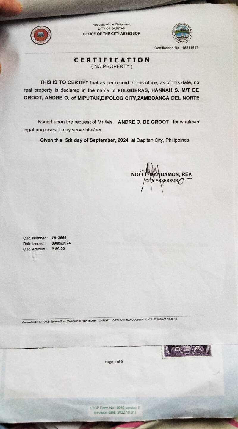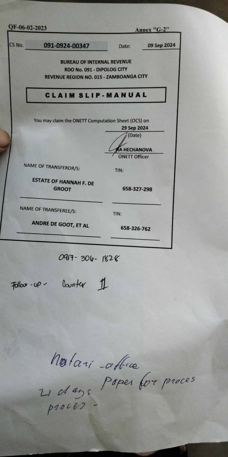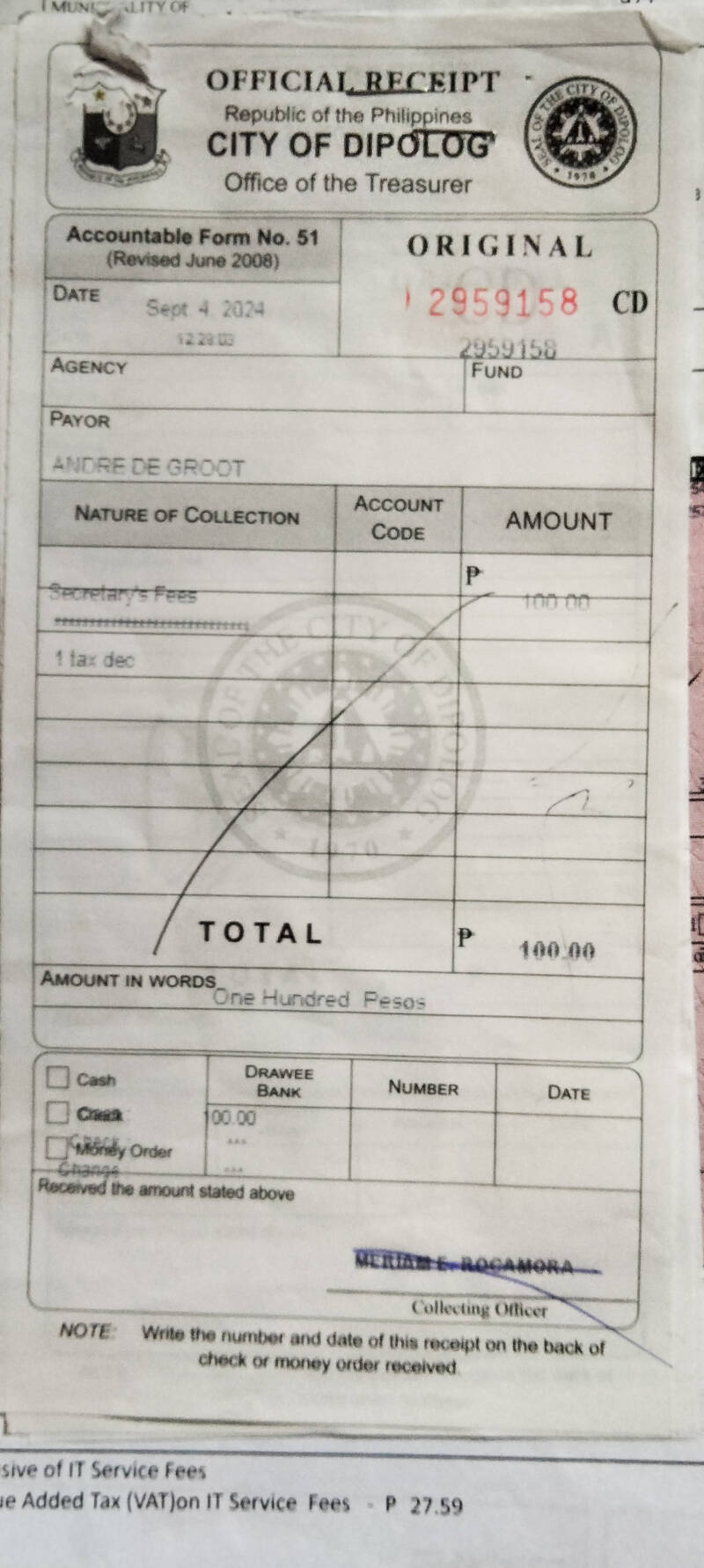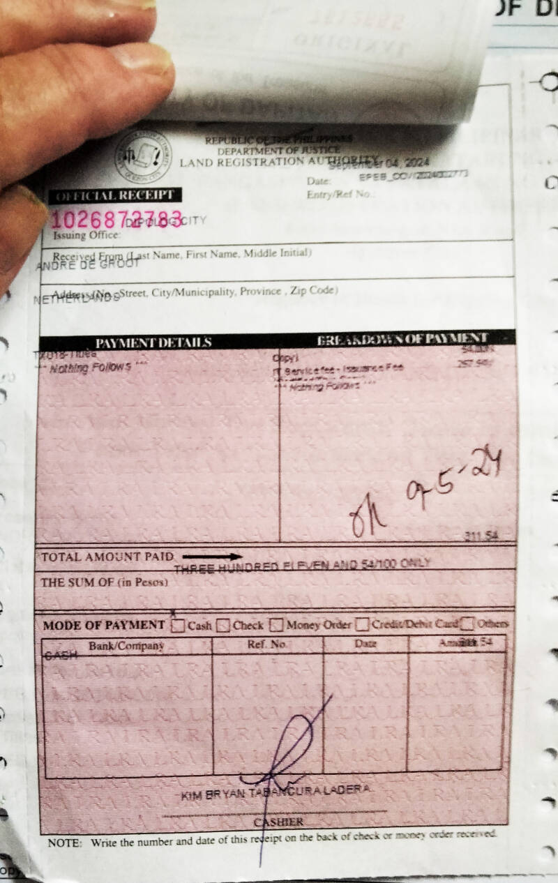 Last of the series I spoke to Mr. Ra Hechanova, the so-called Onett Officer, I thought he was some kind of director, I was on my way to copy a large pile of papers and payments 3 times, but he stopped me and offered to do it for me on the top floor. He arranged everything and I only had to wait 21 days before the whole process was completed. I told him that in 3 weeks I would no longer be in Dipolog and already in the Netherlands. Well then I had to go to a Notary office to have everything arranged by someone else in my name. I finally ended up with my cousin Leira as someone I really trust.