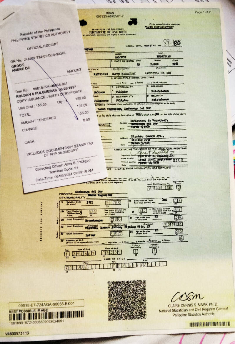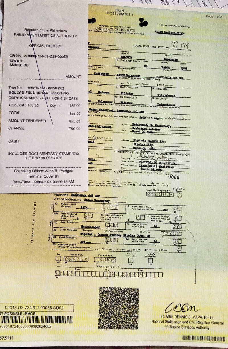 Via een kantoor waar ze mij een registratieformulier gaven ontving ik het advies om naar een advocaat te gaan om mij verder te laten begeleiden. Deze advocaat gaf mij vele adressen op waar ik allemaal bij langs moest gaan, zelfs tot in de plaats Dapitan, een 15 km vanaf Dipolog. Ik heb het allemaal zoveel mogelijk af willen ronden.. De advocaat vroeg mij voor haar bemiddeling het bedrag van Pes 1500,- Bij elkaar heb ik nog veel meer dan Pes 2000,- moeten betalen. Allemaal om bewijsstukken te kunnen ontvangen.