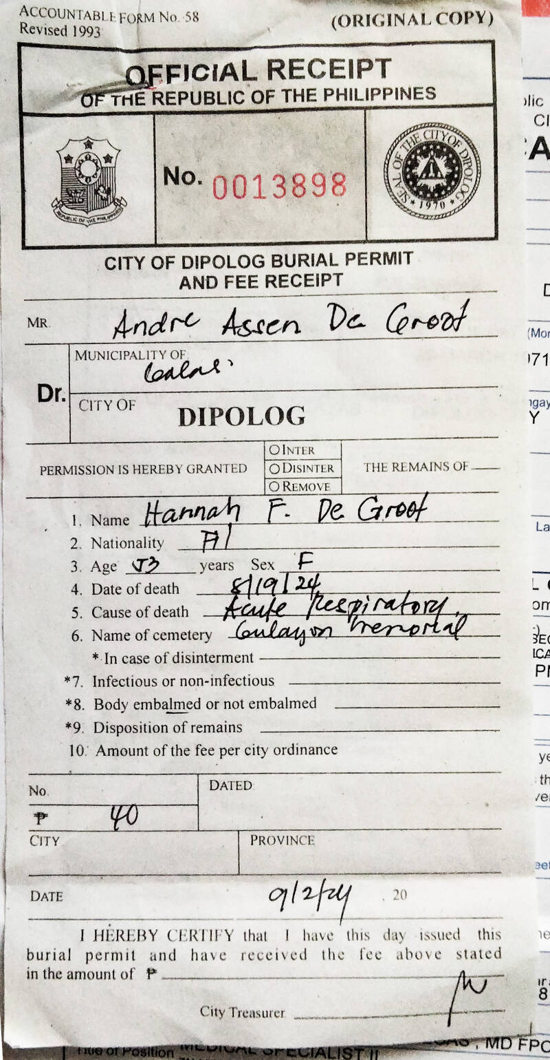 Through an office where they gave me a registration form I received the advice to go to a lawyer to get further guidance. This lawyer gave me many addresses where I had to go, even to the place Dapitan, 15 km from Dipolog. I wanted to complete everything as much as possible. The lawyer asked me for the amount of Pes 1500, - for her mediation. In total I had to pay much more than Pes 2000, -. All in order to receive evidence.